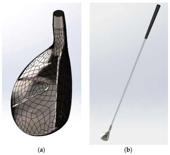 (a) Three-dimensional (3D) scan of the head, imported in SolidWorks. (b) Whole numerical model of the golf shaft.