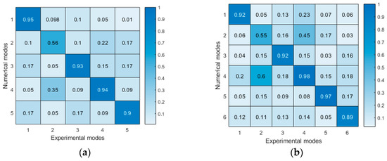 MAC (Modal Assurance Criterion) matrices computed for identified and numerical eigenmodes after updating in (a) free-free and (b) fixed-free boundary conditions.