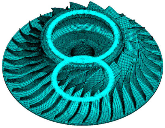 The prototype centrifugal compressor is comprised of two parts: the impeller and the vaned diffuser. The impeller features 17 main blades and 17 splitter blades. The inlet diameter and the outlet diameter are about 165 mm and 310 mm, respectively. The blade heights are about 25 mm and 10 mm at the inlet and outlet of the impeller. The material properties used for the whole impeller are those of titanium (, , ). For this study, the finite element model of the impeller is established in the commercial package ANSYS Mechanical (Version 15.0 64-bit; ANSYS: Canonsburg, PA, USA, 2015) [43]. Additionally, the subsequent modal analysis and harmonic response analysis are performed in ANSYS Mechanical. The model is meshed with the eight-node hexahedral element, i.e., SOLID185 element type in ANSYS, as shown in Figure 2. The front bore of the impeller is constrained circumferentially and the rear bore is constrained axially. The mesh dependency is checked with three mesh models of different mesh density and the result is shown in Table 1. The first 200 frequencies are calculated for these models. Compared with mesh model III, the average frequency error is about 0.71% and 0.01% for the mesh model I and mesh model II, respectively. Considering that the main purpose of the numerical examples is to validate that the proposed resonance conditions and stress calculation are not of concern, mesh model II is employed with sufficient accuracy for modal characteristics.