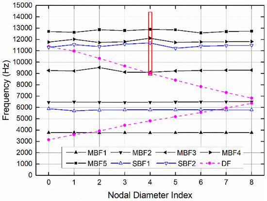 In the conventional resonance conditions, the frequency matching condition and the shape matching condition can be written as Equations (28) and (29), respectively, in which is the excitation frequency, is the natural frequency of the impeller, is the engine order of excitation, which usually takes the number of vanes or struts, is the number of sectors, is the nodal diameter index, and could be any integer.