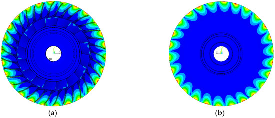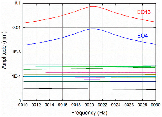 According to the proposed resonance condition (Equation (27)), we know the 13th harmonic component of the mode can be excited by the excitations with and the 4th harmonic component can be excited by the excitations with . Thus, the excitation generated from 21 vanes can arouse the resonance of mode 94 by exciting the 13th harmonic component. Additionally, due to the higher amplitude of the 13th harmonic component, we conclude that the resonant amplitude aroused by the excitations with should be larger.
