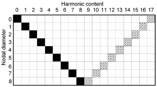 As for the 17-sector impeller used here, the relationship between the nodal diameter index and the harmonic index for a vibration mode is shown in Figure 5, which is obtained by Equation (17). It indicates the harmonic contents of mode 94 contain the 4th harmonic and the 13th harmonic. In order to clearly get the respective contribution of mode 94, spatial harmonic contents analysis of the blade-based RMV is required.