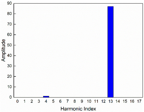 As for impellers with splitter blades, each sector includes one main blade and one splitter blade. If the RMV is extracted based on structural cyclic symmetric property in the same way as the conventionally designed impellers, for example, extracting the displacement at a node at the tip of the main (or splitter) blades, the cyclic symmetry of the mode shape is indeed reflected; however, the influence of splitter (or main) blades on the whole impeller’s traits of modes are ignored. Therefore, to guarantee that the whole structure’s traits of modes are reflected adequately, the influence of splitter blades must be taken into account. Namely, the displacements should be extracted from all main and splitter blades to form the blade-based RMV. For example, is the blade-based RMV for the model as shown in Figure 1. Then, the spatial harmonic contents analysis is performed on it.