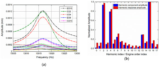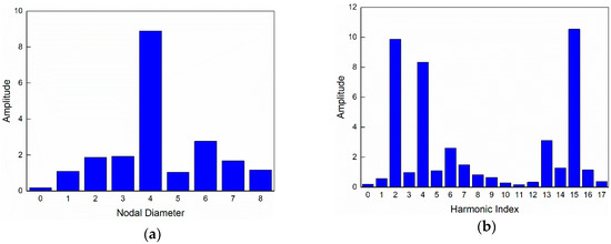 According to Section 2, the evaluating process is now conducted as follows: first analyze the harmonic contents of the target mistuned mode. This can be done by performing spatial harmonic content analysis of the blade-based RMV. Then, determine the engine orders of excitation based on the proposed resonance condition using Equation (27). After that, rank the harmfulness of these excitations according to the corresponding amplitudes of the harmonic components. The spatial harmonic contents analysis result is shown in Figure 7b and the largest three harmonics are: , , and . According to Equation (27), the corresponding engine orders are , and respectively. Thus, the harmfulness of these excitations can be ranked as follows: , , and .