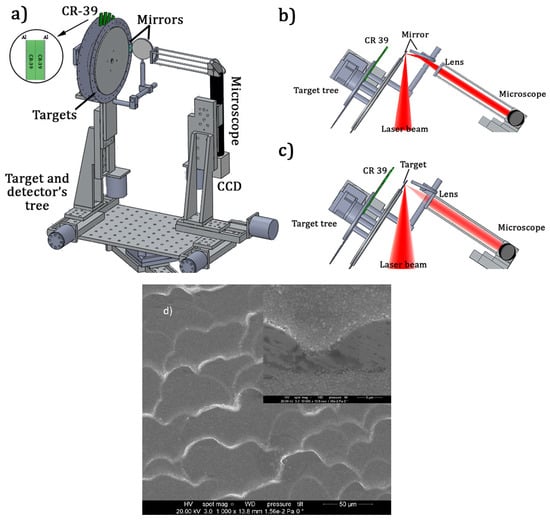 The experimental set-up used in these experiments to analyze the laser spot profile and the proton beams produced by high-power laser-target interaction is original, as shown in Figure 1a. It consists of a target and detector holder ensemble, and an optical analysis ensemble. The target and detector holder system contains translation and rotation mechanical stages for precise alignment of the target in the laser focus. The optical analysis system employed to investigate the laser beam focal spot, shown in Figure 1a, is placed in front of the target holder system. The target and detector holder system consists of two parallel metallic plates (with a diameter of 200 mm), as illustrated in Figure 1a. The first plate holds the targets, where the distance between the centers of two adjacent targets is around 20 mm. The second plate holds the CR-39 plastic detectors (13 × 37 × 1 mm3, purchased from Track Analysis System Ltd (Bristol, UK)), located at 3 cm distance behind the first plate. The detectors are centered relative to the targets position. Both plates are rotated simultaneously by means of an electronically driven mechanical stage, thus avoiding any misalignment between targets and detectors. The target and detector holder ensemble is tightly fixed on mechanical translation stages, to achieve a precise x-y-z alignment in the focus of the laser beam. The optical analysis system located in front of the target and detector holder ensemble consists of an optical microscope coupled with a Basler Charge-Coupled Device (CCD) optical camera, with a resolution of 0.976 µm/pixel. The CCD camera was placed in a sealed metallic cylinder at atmospheric pressure, allowing us to perform direct and continuous observation of the laser beam spot profile on target, under high vacuum conditions. As illustrated in Figure 1b,c, the system is used both for laser beam focal point profile analysis (see Figure 1b) and to visualize the laser spot reflected light on the target surface (see Figure 1c). Thus, the influence of the target surface morphology on the laser spot profile can be investigated. The target and detector holder ensemble, together with the laser spot analysis ensemble make up a compact system which exhibits significant advantages: lack of misalignments between targets and detectors; direct and front side visualization of the laser spot with high accuracy (1.25 µm/full step of rotation stage), prior to each laser-target interaction.