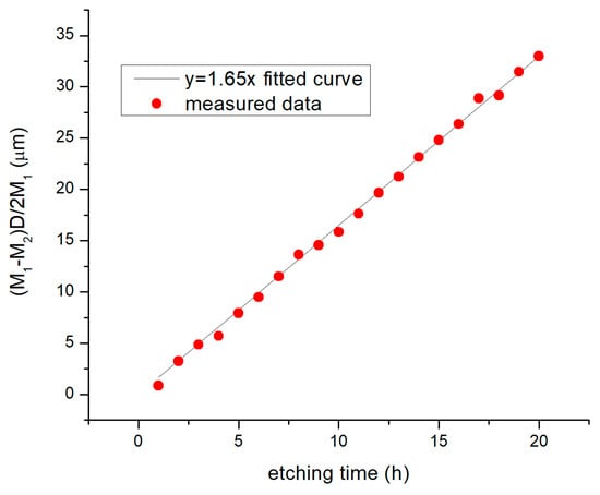 Figure 2 shows a graphical representation of equation 1, which results from measurements (red points). By linear fitting (black line) of these experimental data with the analytical function y = ax (a = 1.65), the bulk etch rate of the CR-39 detectors was determined. A bulk etch rate of 1.65 ± 0.05 µm/h over an etching time of 20 h was calculated (see Figure 2).