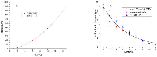 The proton range can also be computed using the TRACK-P software, but only for 1 mm thick CR-39 detectors and maximum incident proton energy up to 11 MeV [22]. The results on the proton range calculated with the TRACK-P software using as input data a bulk etch rate of 1.65 µm/h, a 6 h etching time value, and a 90° proton incidence angle on the detector, are presented in Figure 4a (red points). The percentage errors on the proton range calculated with TRACK-P with respect to SRIM lie within a 3% range.