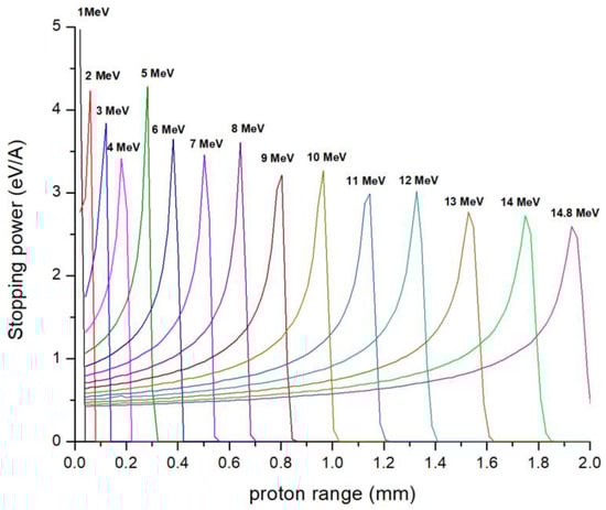 The proton range and consequently the Bragg peak position for different proton energies within the stack of CR-39 detectors stack was calculated using the SRIM code [23] (Figure 4a). Figure 5 and Table 1 present the Bragg curves and the Bragg peak position for protons with 1–15 MeV energy range as a function of the incident proton energy. It can be observed that protons with energies higher than 10.5 MeV are fully stopped into the second CR-39 detector, while the first CR-39 detector (1 mm thick) only acts as a filter.