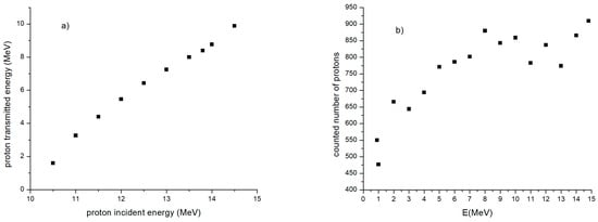 (a) Dependence of proton transmitted energy through 1 mm thick CR-39 detector on incident proton energy within the 10–15 MeV range; (b) Counted number of protons stopped in 2 mm CR-39 detector as function of incident proton energy.