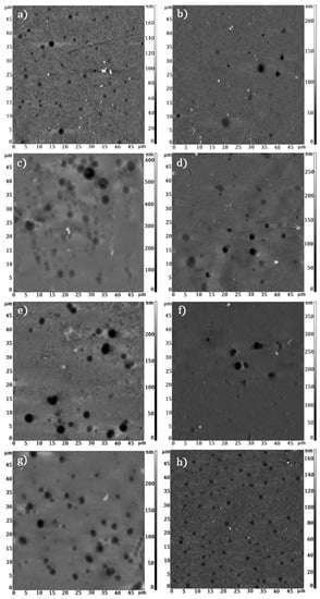 Figure 3 show the images of the tracks left by protons within the detector, for proton energies of 2, 3 and 5 MeV. The corresponding measured track diameters of the protons are 5.5 µm, 4.5 µm and 3 µm, respectively. Besides circular proton tracks, in Figure 3a–c, some traces with irregular shapes and sizes attributed to the chemical etching of the detector material unmarked by protons, can be observed. Similar values for the proton track diameters are obtained after the analysis of the post-etched CR-39 detectors using atomic force microscopy.