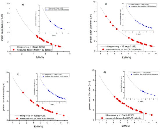 The evolution of the proton track diameter on the incident proton energy for both CR-39 detectors, within the 1–9 MeV range, is shown in Figure 8 together with the fitting curve previously presented in Figure 4b. As the dependence of the pits identified on the front side of the second CR-39 detector is also an exponential one with respect to energy, result that the measured track diameters can be attributed to protons.