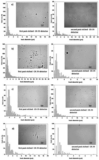 As a result of counting and geometrical shape analysis of protons, the histograms of the minor axes of the track diameters obtained from the acquired optical images of the post-etched CR-39 detectors were plotted (see Figure 9). The x axis of each graph begins at 0.88 µm, as it represents the minimum number (within ±15% error) of tracks in CR-39 detectors that can be attributed to protons (as seen in Figure 4b).