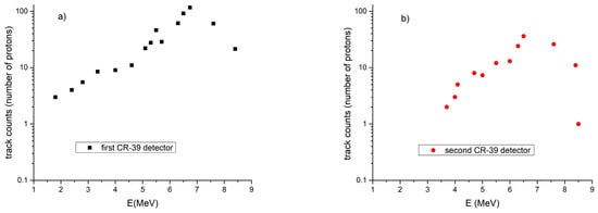 In Figure 10, the spectral distribution of protons stopped in each CR-39 detector after the interaction of the high-power laser pulse with the Al target of 5 µm thickness is presented. It can be observed that the experimental data presented in Figure 10 are similar with the theoretical predicted one shown in Figure 6b in the 1–9 MeV energy range. The graphical representation of the counted number of protons stopped in the first and second CR-39 slab (see Figure 10a,b) present discontinuity points at ~3.3, 5.5 and 6.7 MeV respectively at 4.3, 5.5 and 6.6 MeV. As the revealing of the proton track depends on the etching conditions of the CR-39 detectors, we suppose that these discontinuity points can be linked with the etching process of the detector material as they are slightly different from those identified in Figure 6b.