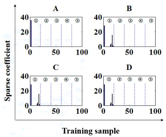Sparse solutions under different fault tolerances. (There are a total of five classes of training data, each containing 20 samples of infrared spectral data separated by dashed lines; the numbers above the interval represent different classes; e.g., ① denotes the first class; A, B, C, and D stand for the sparse coefficient distributions under different fault tolerances; this figure shows one specific prediction sample that belongs to the first class.)