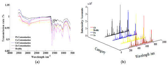 Spectral data of Tegillarca granosa polluted by different heavy metals. (a) Infrared spectral data. (b) Laser-induced breakdown spectral LIBS data.