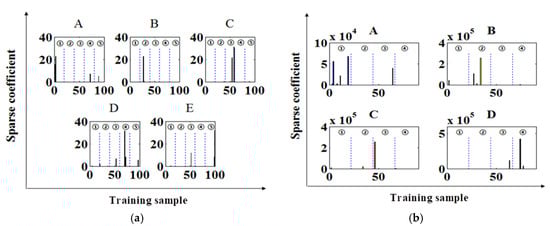where denotes the second-order norm of this vector. In case of the second-order norm, the solution of is not very sparse, which does not have a positive effect on classification recognition. To determine the sparse solution, according to the definition, the zero-order norm of the space will be minimized by solving the linear Equation (5)