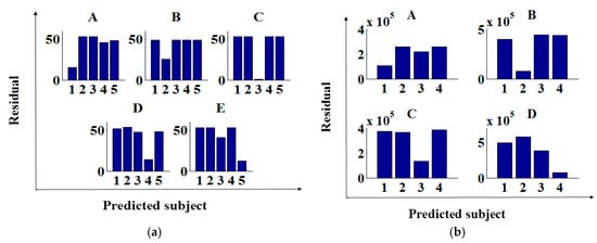 Residual between the estimated prediction samples based on different classes of training samples and the actual prediction samples. (In each graph, each column represents a class of prediction samples; A, B, C, D, and E denote the prediction samples that belong to the first through fifth classes, respectively; Symbols ①–⑤ stand for Pb, Cu, Cd, Zn, and Healthy categories for the infrared spectral data; Symbols ①–④ stand for Cd, Healthy, Pb and Zn categories for the LIBS data, respectively, the units of residual can be referred to the units of the data in Figure 3.) (a) Infrared spectral data, (b) LIBS data