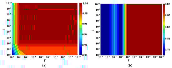 As indicated by the parameter analysis of the LRSC algorithm in Section 4.1, being different from other algorithms, its classification process depends little on parameter optimization. Theoretically, when the sparseness degree changes because of the parameter (such as the parameter T) setting, e.g., when the sparseness degree increases, perhaps only one or two non-zero solutions can be found. The positions of these solutions recognize the training samples to which the prediction samples are most similar, and the corresponding classification labels can still be found. In the case of the infrared spectral data under one sample division, in Figure 6a, T and λ were selected as the parameters for LRSC (T: 10−1, 10−2, 10−3, 10−4, 10−5, 10−6; λ: 10−1, 10−2, 10−3, 10−4, 10−5, 10−6, 10−7, 10−8). With the grid method used to select the parameters, the recognition rates changed slightly, both reaching more than 90%. Similarly, in Figure 6b, different parameters were used, which, again, did not have a significant impact on the classification of the LIBS data. Even the value of λ made little contribution to the accuracy.