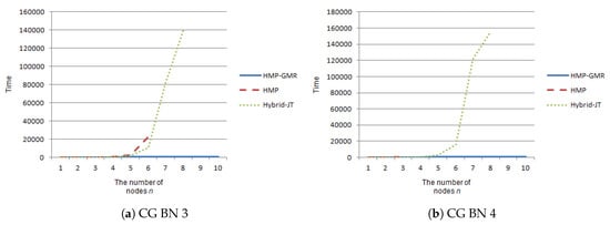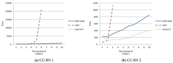 Results for CG BNs 1 (Figure 4a) and 2 (Figure 4b) show a similar pattern. The HMP algorithm with no GMR exceeded the time limit at n = 7 and n = 4, respectively. Execution times for HMP-GMR were higher than those for Hybrid-JT in both cases. The increase in execution time for both HMP-GMR and Hybrid-JT was linear in n.