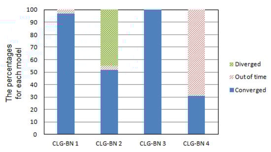 Figure 6 shows percentages for each CLG BN for which the algorithm converged, diverged and ran out of time. For CLG BN 1, the algorithm converged in 97% of the runs and ran out of time in 3% of the cases (execution time > 200,000 ms). For CLG BN 2, the algorithm converged in 52% of the runs, ran out of time in 3% of the runs and diverged in 45% of the runs. For CLG BN 3, the algorithm converged in 100% of the runs. For CLG BN 4, the algorithm converged in only 31% of the runs and ran out of time in 69% of the runs.