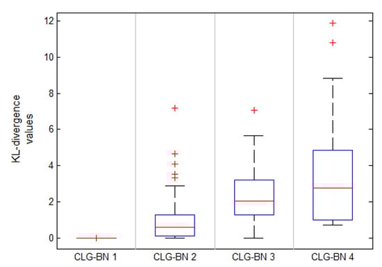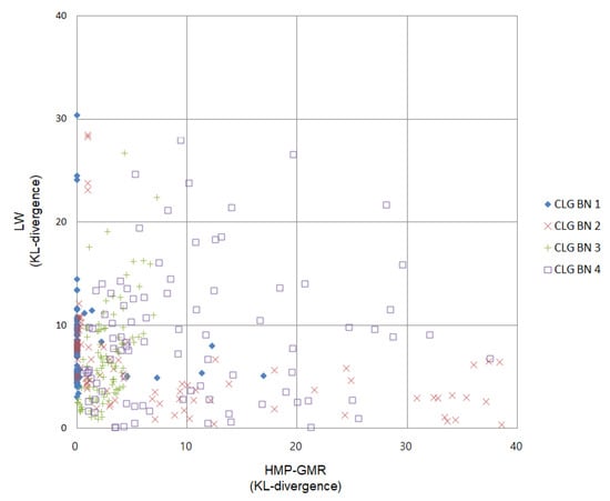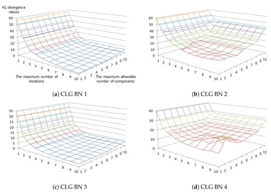 Table 4 shows minimum averages for KL-divergences in Figure 8 and best values for  and  (numbers in parentheses are standard deviations). For example, for CLG BN 1, the minimum average for KL-divergence was 0.78 and its standard deviation was 3.37 at  = 5 and  = 10. For CLG BN 4, the minimum average for KL-divergence was 11.37 and its standard deviation was 8.44 at  = 1 and  = 8.