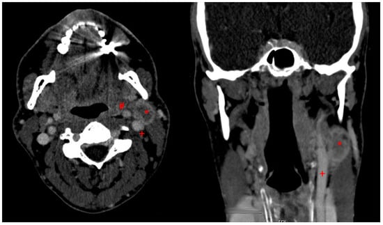 Axial (left) and coronal (right) cross sectional radiographic images of a lymph node metastasis (*) of the left cervical level IIb of a 38 years old male patient suffering from an advanced squamous cell carcinoma of the oral cavity at retromolar region (UICC stadium IVa). Primary carcinoma has been surgically removed with a surrounding safety margin. Due to the metastasis´ closeness to the vascular wall of the arteria carotis interna (#) and externa (+), a surgical removal could not be performed with a safety distance. Biopsy testing for the presence of possible remaining tumour cells at the vascular wall could not be performed. So, possible remaining tumour cells can be the reason for tumour recurrence or metastasis.