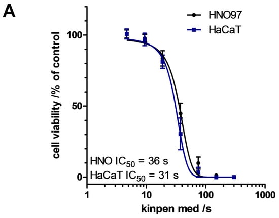 CAP expels reactive species which are known to confer cytotoxic effects in eukaryotic cells in a concentration dependent manner. HaCaT keratinocytes and HNO97 cells were exposed to plasma-treated medium and their metabolic activity was reduced in a treatment time-dependent manner (Figure 2A). In order to compare both cell lines an IC50 value was calculated by sigmoid regression of relative resorufin fluorescence as a function of treatment time. The viability after incubation in CAP treated medium between both cell lines revealed very similar IC50 values; that is, 31 s for HaCaT keratinocytes and 36 s for HNO97 cells (Figure 2A). This suggests a comparable sensitivity towards plasma-induced redox stress for these two cell types of epidermal origin.
