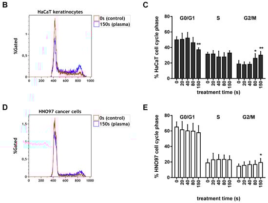 The distribution of DAPI-stained cells was analysed according to the histogram plot of DNA content against cell numbers of both cell lines (representative examples are shown in Figure 2B,D. In HaCaT keratinocytes, CAP treated medium (80 s and 150 s) caused a significantly elevated level of cells in the G2/M phase concomitant with a decrease in the proportion of cells in G0/G1 (Figure 2C). Of untreated cells 49% were in G0/G1 phase while this portion decreased significantly to 37% after 150 s CAP treatment. At the same time, cells in the G2/M phase increased from 18.6% to 30% for 150 s of CAP exposure. The impact of CAP treated medium on HNO97 cell cycle progression was less pronounced and revealed a decrease from 65% to 57.7% in the G0/G1 phase and a significant increase of 14.5% to 19.3% in the G2/M phase (Figure 2E).