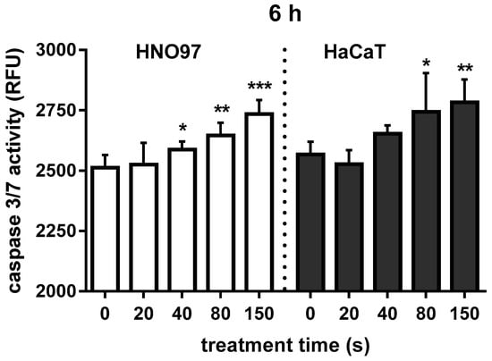 Both cell lines, normal and head and neck squamous cell carcinoma cells, significantly activated caspase 3/7 when incubated in CAP treated medium. (Figure 3). A treatment time dependent activation of caspase 3/7 was present after CAP exposure in both cell types. Hence, significant activation of caspase 3/7 levels occurred after the longest treatment times of 80 s and 150 s (Figure 3). This result indicates a non-selective induction of apoptotic events in both cell lines.