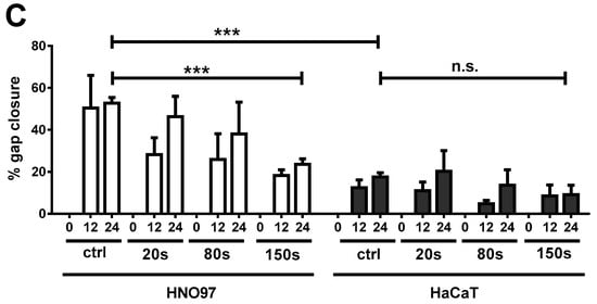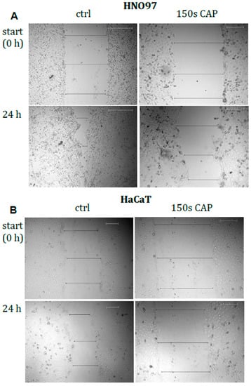Motility and migration were analysed in a 2D-setup following incubation with CAP-treated culture medium comparing non-malignant and head and neck squamous cell carcinoma cells. Into a confluent layer of cells, the scratch width was measured at start (0 h), after 12 h and 24 h following addition of CAP-treated culture medium. By comparison, untreated HNO97 cells moved significantly faster (Figure 4A) than untreated HaCaT keratinocytes (Figure 4B); gap closure within 24 h constituted 50% and 20%, respectively (Figure 4C). CAP treatment on HaCaT cells had no significant influence for the tested treatment time regimen (Figure 4C). However, in head and neck squamous cell carcinoma cells gap closure was significantly reduced from 50% in untreated cells to 20% after CAP treatment. In summary, CAP treatment caused a significant impairment in the motility behaviour of HNO97 while HaCaT keratinocytes remained nearly unaffected.