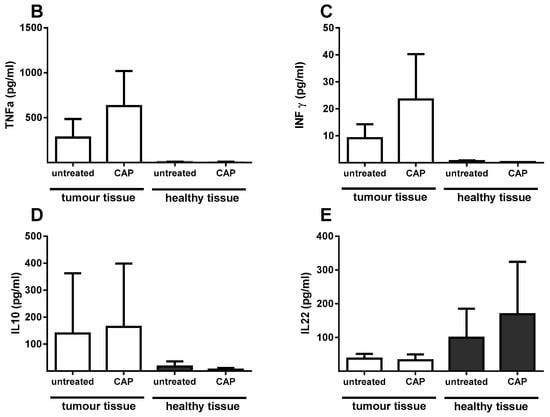 Taken together, the results revealed that tissue of healthy and malignant origin differed significantly in their response to CAP treatment. Induction of apoptosis occurred predominantly in tumour tissue while in healthy tissue the impact of CAP was not significant. This finding inspired us to look for mediators like cytokines in conditioned medium in a preliminary test. Tumour necrosis factor α (TNFα), interferon γ (IFNγ), interleukin (IL) 10 and IL22 were detected and results are presented in Figure 6B–E. Due to small sample size and inter individual variances, only a tendency can be derived (Figure 6B–E). Strikingly higher concentrations of IL22 were released from healthy tissue while INFγ, TNFα and IL10 were found predominantly in tumour tissue of the corresponding patient (Figure 6B,C,D). CAP treatment tends to increase the levels of TNFα and IFNγ in tumour tissue but showed no effect in corresponding healthy tissue.