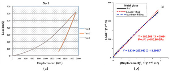 Three nanoindentation measurements are performed for each sample and the average values are taken. The original (loading-unloading) and deduced loading (P) versus square of displacement (h2) (loading-unloading) diagrams of metallic glass (sample #3) sample in the nanoindentation test are shown in Figure 7 as an example. The elastic coefficient and hardness measured by nanoindentation are calculated with assumed Poisson ratio and tabulated in Table 3.