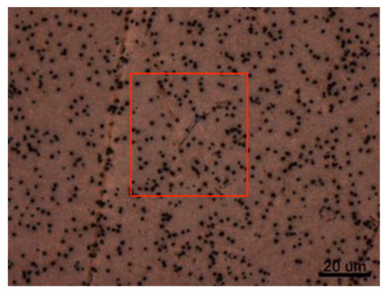Different from that of conventional metals the atoms of metallic glasses are “frozen” in a random, disordered structure, rather than arranging themselves into repeating patterns of grains, just like glass. The metallurgical microscopic photo of BMG sample (500×) is shown in Figure 8. In general, it is homogeneous and no well-defined grain boundary can be found, although there are sparse precipitate crystalline phases as indicated in the area enclosed by the red bracket. It may be regarded without question as poly-crystalline or even amorphous depending on the manufacturing process.