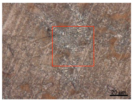 The metallurgical microscopic photo of CM247LC sample (500×) is shown in Figure 9. The dendrite structure can be seen with no pores. It is not refined or directionally solidified so that there is no unified grain growth although columnar grains i.e., polycrystalline [23] may exist in different directions with strong matrix gain boundary with carbide and γ–γ’ eutectic phase as indicated in the area enclosed by the red bracket. One common trait for both materials is the disordered structure and broken grain boundary.