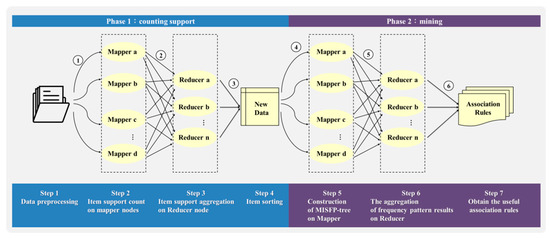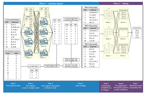 To enhance the efficiency of FP mining with multiple item support, we propose an architecture (named the MISFP-growth algorithm) based on a distributed computing environment, known as Hadoop MapReduce. The main idea of the MISFP-growth algorithm is to split the transaction datasets into sub-transaction DBs according to item support, and then to analyze them respectively. More specifically, transactions that contained items with identical item support would be grouped to form a sub-transaction DB. Then, the FP-growth algorithm constructed an FP-tree from these sub-transaction DB and then mine the frequency patterns. To further improve efficiency, we implement the MISFP-growth algorithm on distributed architecture, which enables individual analysis of the sub-transaction DBs. Finally, the analysis results from each reducer were further aggregated to generate association rules for the entire dataset. The proposed Hadoop MapReduce-based MISFP-growth algorithm consists of two phases, a counting support phase and an analytics phase, executed in seven steps, as depicted in Figure 1, and detailed below.