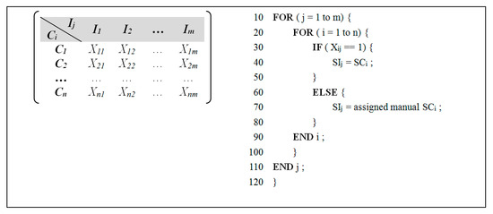 The pseudo code of COI is shown in Figure 2. For illustration, assume that ten items (including: glass cleaner, shower gel, chocolate, whiskey, cleaning rags, cleansing milk, chewing gum, broom, shampoo, and popcorn) are represented by I1, I2, …, I10, as shown in Table 3. There are three support levels for the product classes: C1: home cleaning = 0.1, C2: beauty cosmetic = 0.15, and C3: snacks = 0.2. Take I1 as an example: as X11 = 1 represents I1 is categorized as the C1 class, then the item support of I1 is equal to 0.1. Conversely, looking at I4 as an example: as X14 = 4, from n + 1, this means that I4 does not belong to any product class. Therefore, decision makers must manually define item support, in this example, the item support value of I4 = 0.05. Thus, COI can quickly set the multiple item support thresholds. In this example, COI categorized items as follows: {I1, I5, I8: C1 = 0.1}, {I2, I6, I9: C2 = 0.15}, {I3, I7, I10: C3 = 0.2}, and {I4: C4 = 0.05}.