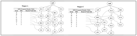 As illustrated in Figure 3, first, the MISFP-growth algorithm scans the transactional database once to find the support value and determine the MIN-MIS = MIN{MIS(A), MIS(B),…, MIS(J)} = 2 as shown in Table 4b. Next, the MISFP-growth algorithm sorts item {A} to item {Z} in ascending order according to item support to satisfy MIN-MIS. Therefore, items {D} and {F} are removed because their support is less than MIN_MIS. The results are presented in Table 4c. The MISFP-growth algorithm splits the transaction dataset into subgroups according to MIS values and assigns the subgroups to different mapper nodes. Each mapper node then scans the assigned sub-transaction DB to obtain the support value of each item and construct an MISFP-tree. This process resembles that of the frequency pattern tree constructed by the FP-growth algorithm.