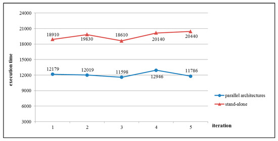 In Experiment 3 (Exp. 3), we tested the efficiency of the proposed algorithm on the retail market basket dataset [30]. The verification process was implemented in five iterations. The experiment environment consisted of a virtual machine with an Ubuntu 12.04 LTS operating system, Apache Hadoop 2.2.0 Cluster, 8 GB memory capacity, and Apache Mahout 0.8. One of the nodes was set as the master node, and two nodes were set as data nodes. Per the experiment results shown in Figure 6, the average execution time of 12,105.6 ms achieved by the parallel architectures represents a reduction of approximately 38% compared to the average execution time of 19,586 ms attained by the stand-alone operation.