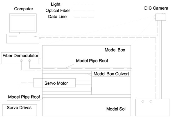 Table 2 summarizes the monitoring equipment used in the experimental tests. A DIC binocular camera was applied to monitor the three-dimensional displacement of the ground surface, and distributed optical fiber was used to monitor the deformation of the model pipe roof.