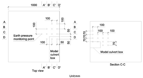 Earth pressure cells were used to record the earth pressure variation during the excavation tests. To ensure the spacing requirement of the earth pressure cells, only one direction of earth pressure was measured in one experiment. Thus, the vertical and horizontal earth pressures of one measuring point were obtained through multiple experiments. Due to the presence of the pipe roof, the layout of the earth pressure cells is different under conditions with or without the pipe roof, as shown in Figure 6 and Figure 7, respectively.