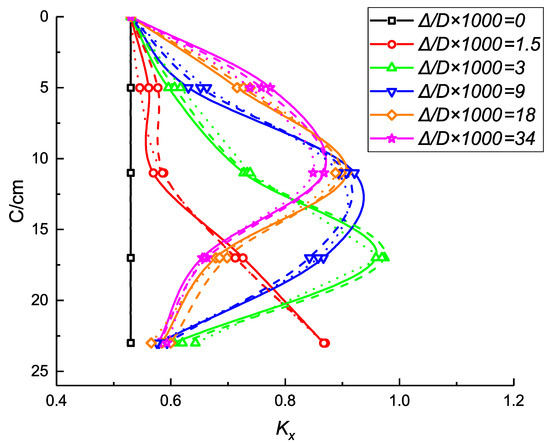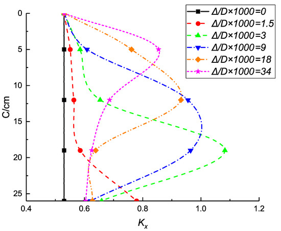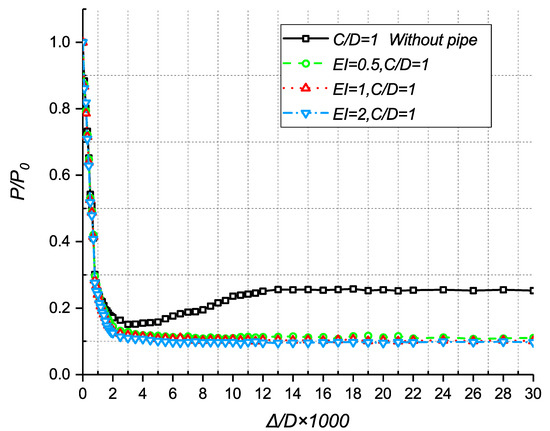 Figure 8 shows the variation of the ratio P/ with the excavation face displacement (/D); P and denote the pressure applied to the excavation face and its initial value, respectively. D is the height of the rectangular excavation face. This shows that the pressure for the test without the pipe roof drops rapidly first; after reaching the minimum value, it increases slowly up to a stabilized value. For tests with the pipe roof, the pressure also drops rapidly to a stabilized value. The influence of pipe stiffness () on the variation of P/ is very low.