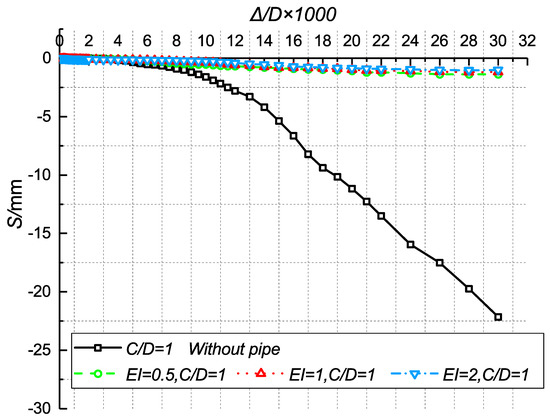 Figure 9 shows the variation of the maximum ground settlement with the ratio (/D× 1000) for the tests conducted with and without the pipe roof. The maximum settlement was observed at approximately 0.25D in front of the excavation. The presence of the pipe roof induces an important decrease in the ground settlement. Increasing pipe stiffness reduces the soil settlement; however, this influence is weak. The initial stage corresponds to the fast reduction in the load. The sliding block moves, the pipe roof deforms, the soil arch is generated and a small settlement occurs when the surface settlement enters the development stage. The displacement of the excavation face continues to increase until the pipe roof is balanced with the upper soil arch and supports the overburden pressure. Finally, the sliding block is separated from the upper pipe roof and the surface settlement becomes stable.