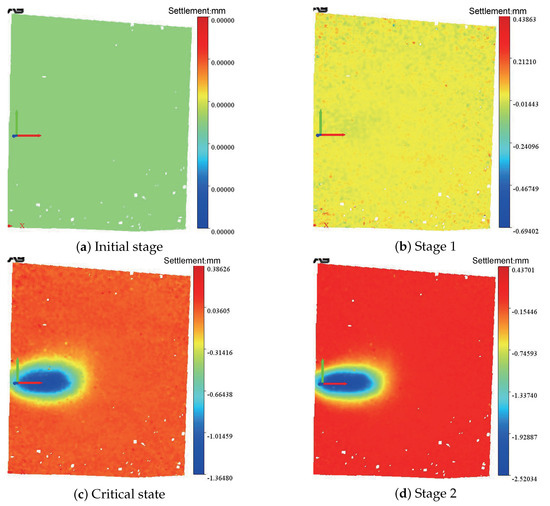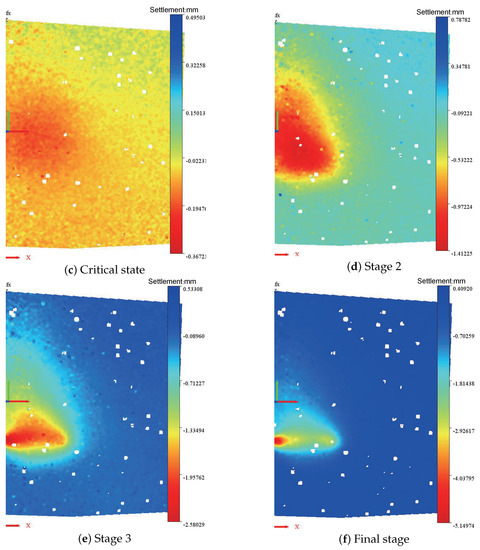 The white void in Figure 10f is due to excessive deformation of the ground surface in the final stage. The black stone speckle slipped off, and the adjacent two photographs are not recognized by the corresponding algorithm, which results in a calculation error.
