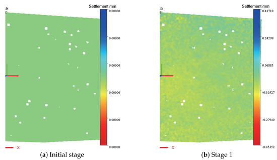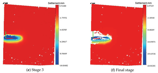 Figure 10 shows the three-dimensional maps of the ground surface settlement without the pipe roof. The surface settlement area is concentrated on the left side due to the frictional force with the plexiglass. The settlement zone has a spindle shape with a lateral width much greater than the longitudinal length. At the end of the initial development stage, a spindle-shaped settling tank appeared in the ground surface. With the movement of the excavation face, the settlement inside the spindle-shaped settling tank increased, but the range did not change during the experiment.