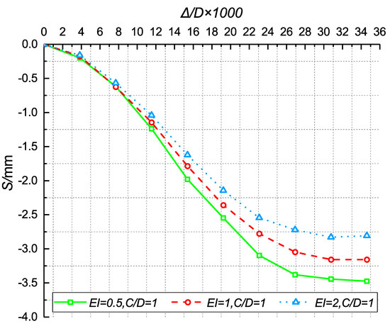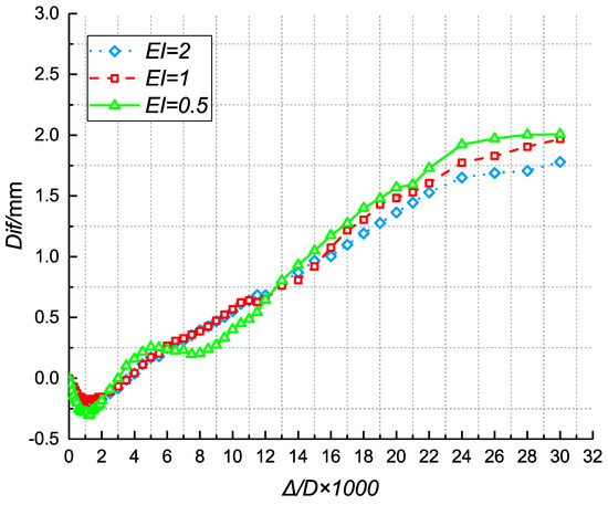 Figure 14 shows the comparative analysis of the vertical deformation of the pipe roof and the corresponding surface settlement. is defined as the difference between the ground settlement and the pipe deformation. Under the same working conditions, the vertical deformation of the pipe roof is greater than the corresponding ground surface settlement. decreases with increasing excavation face displacement and is insensitive to the relative pipe stiffness, reflecting the continuous development of the soil arch structure.