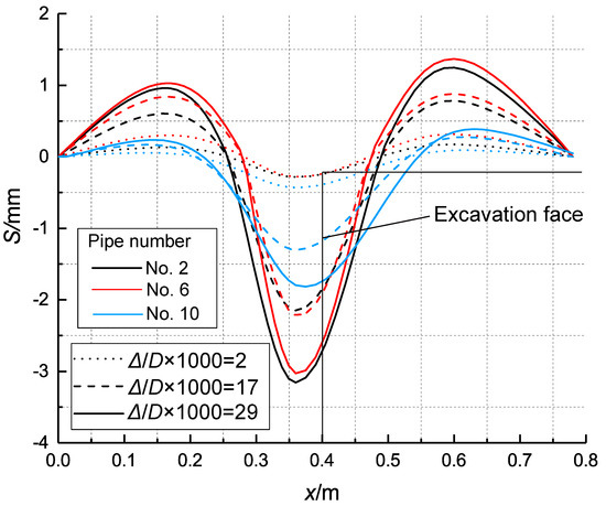 Figure 13 shows the shape of pipes with relative stiffness = 1.0. The maximum point of vertical deformation of the pipe roof is approximately 35 mm in front of the excavation face. The vertical deformation of pipe No. 10 accounts for approximately 60% of that of pipe No. 2 and No. 6 (Figure 5), indicating that the vertical deformation of the central pipe is significantly larger than that of the edge pipes.