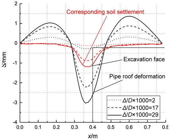 Figure 15 shows the comparison between the shape of the pipe roof and the settlement tank of its vertical projection line on the ground surface when the pipe relative stiffness is 1.0 and the buried depth ratio equals 1. The shape of pipe No. 6 and the corresponding surface settlement curve are selected. Figure 14 shows that the range of ground settlement is larger than that of the pipe roof deformation. The maxima of the soil settlement and pipe roof deformation are located at approximately 0.25D from the excavation face.