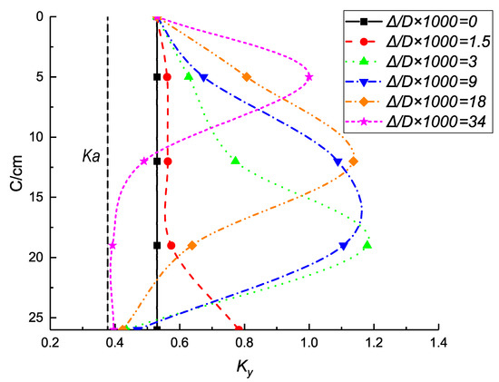 Figure 17 shows the variation of the longitudinal lateral pressure coefficient () during the test. It has the same trend as the horizontal pressure coefficient, but the final value of in the lower part is smaller than ; it is close to the active earth pressure coefficient . The change in lateral pressure coefficient in the two directions reflects the formation of the soil arch.