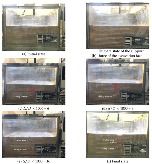 White sand layers were used in the experimental tests to follow the soil deformation during the excavation process. Figure 20 shows the instability process development during a test without the pipe roof. Figure 20b shows the initiation of the shear sliding zone in front of the rectangular excavation face. Figure 20c–e show the settlement of the soil layer corresponding to the different excavation face displacements. It can be clearly seen that the horizontal white quartz sand line was bent from the bottom to the top and extends to the surface, and the width of the settlement was measured as 0.4D. Then, the settlement appeared on the ground surface with a settlement width equal to the longitudinal width of the failure zone. In Figure 20f, the failure zone extended to the ground surface, and the soil arch was completely destroyed.