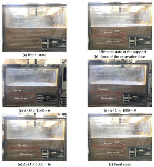 Figure 21 shows the results of the excavation supported by a pipe roof with = 1.0. The obvious curvature of the horizontal white quartz is caused by the sand leakage in the gap between the plexiglass panels and the pipe roof. The settlement of the ground surface can be determined by the change of the white line. Similar to the test without the pipe roof, Figure 21c–e show the settlement of the soil layer corresponding to the different excavation face displacements. The horizontal white quartz sand lines were bent slightly from the bottom to the top but did not extend to the ground surface. The pipe roof blocked the development of the sliding surface and the width of the soil arch was different from the width of the top of the sliding block. Figure 21f shows the final state with a settlement of 0.6D. The pipe roof and the overlying soil with the soil arch reached the state of stress balance, and the failure zone does not extend to the surface.